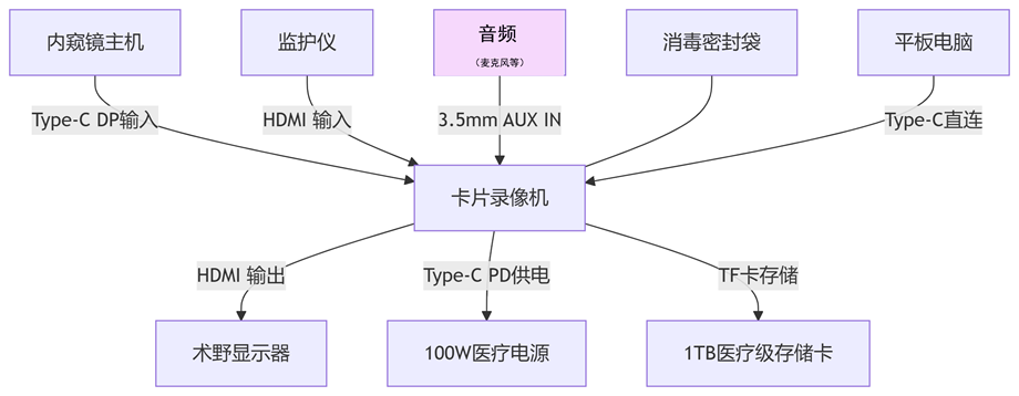 2.医疗设备直连:Type-C 口直连内窥镜 DP 输出(如 Stryker / 奥林巴斯系统);HDMI 口采集监护仪 / 超声刀 4K 信号,并自动降为 1080P60 录制。