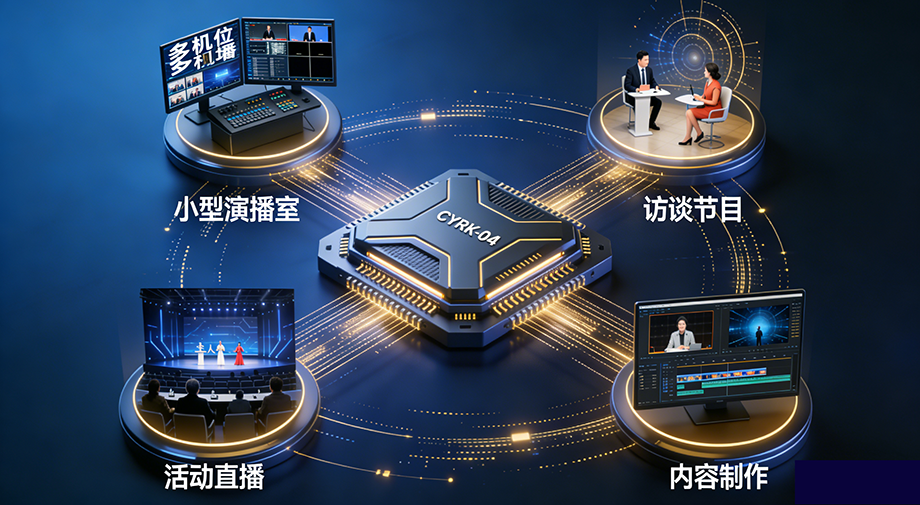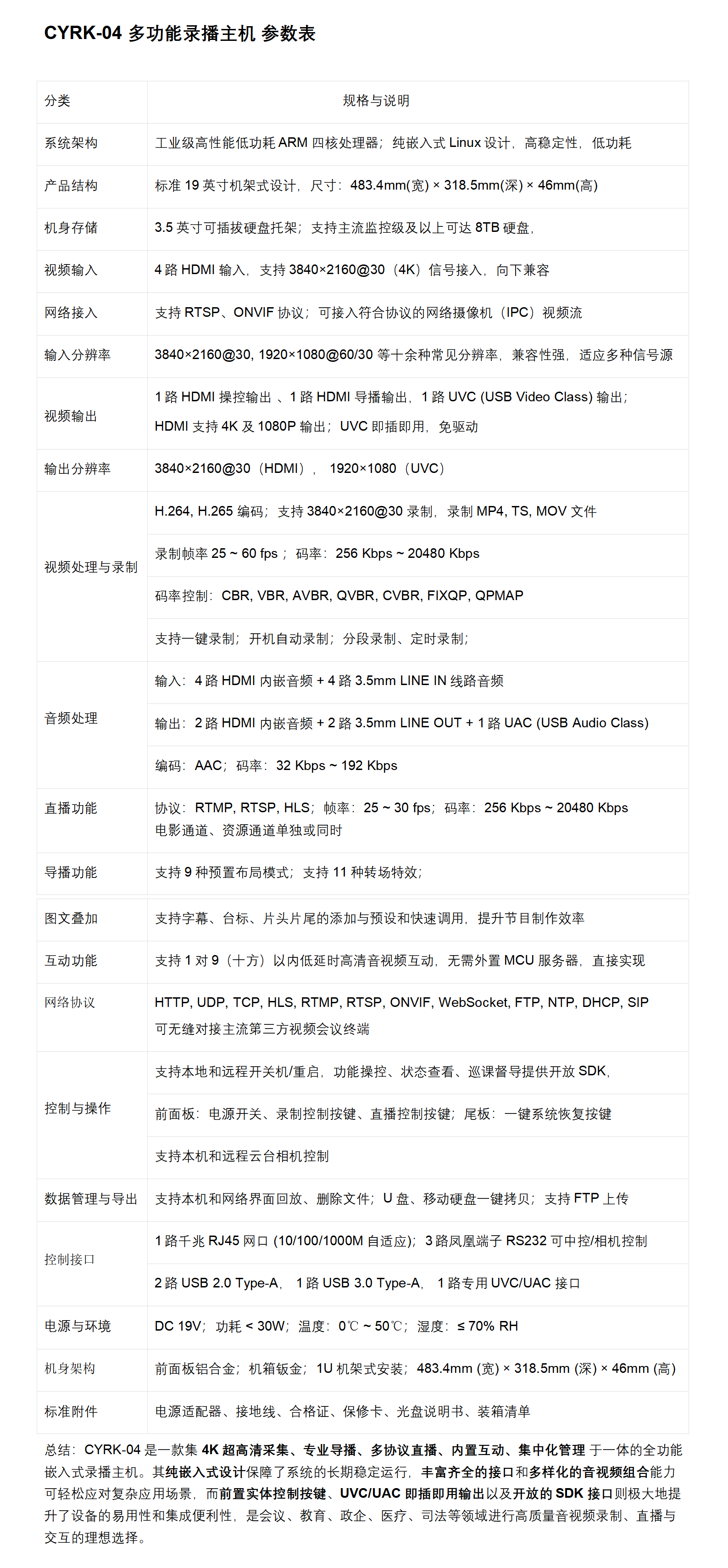 CYRK-04是深圳春源丽影电子科技有限公司推出的一款高度集成、功能强大的4K录播主机。设备采用工业级高性能低功耗ARM四核处理器,搭载稳定可靠的嵌入式Linux操作系统,专为多路音视频采集、处理、录制、直播与导播一体化需求设计。它以嵌入式架构为核心,支持4K超高清画质,具备多样化的音视频接入与输出方式,集录制、直播、导播、互动、平台管理于一体,为用户提供智能、便捷、稳定的一站式音视频解决方案。