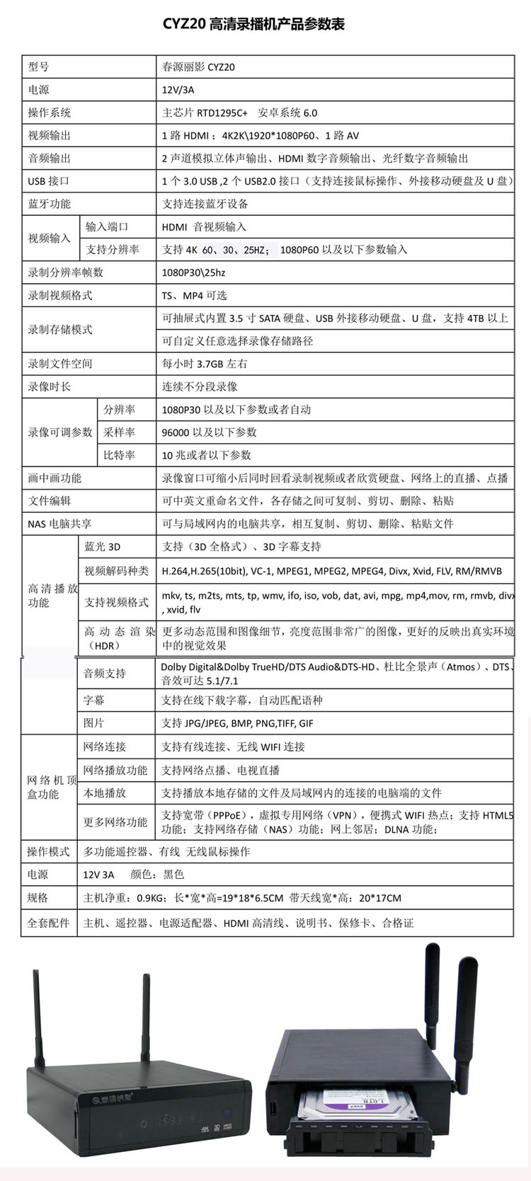 CYZ20方案集网络电视机顶盒、蓝光高清播放机、HDMI输入高清硬盘录像机于一体,采用抽屉式内置硬盘安装方式,还可通过USB外接移动硬盘、U盘进行高清播放和录像。无论是在线电视直播还是网络点播,均清晰稳定流畅;支持解码播放各类4K3D蓝光视频;支持4K、1080P60hz输入高清录像;还具有局域网共享功能等。该机适合家庭替代数字电视机顶盒、用于播放硬盘里的各类4K3D蓝光高清视频、高清粉丝录制数字电视机顶盒、录制蓝光高清播放机以及企事业医疗单位录制视频会议、录制医疗内窥腹腔镜等领域使用。