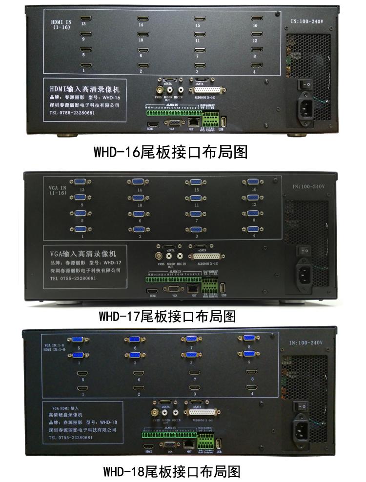 16路机型有三款,既WHD-16,支持16路HDMI输入;WHD-17,支持16路VGA输入;WHD-18,支持8路HDMI、8路VGA输入。另外还可根据客户需要定制8路HDMI输入的机型;8路VGA输入的机型。春源丽影还提供8路3G-SDI输入的录像机CYSDI-02机型、16路3G-SDI输入的CYSDI-03机型。