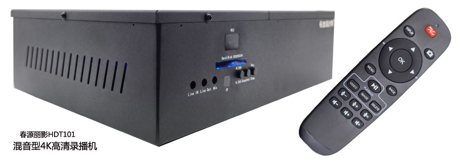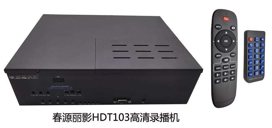 春源丽影HDT103会议录播机,具有4个HDMI输入接口,HDMI支持有音频或者无音频输入;具有1个3.5麦克音频输入接口、1个3.5线路音频输入接口;三种音频可以与HDMI输入的视频同步混音录制。具有1个3.5音频监听接口。具有1个HDMI音视频输出接口。