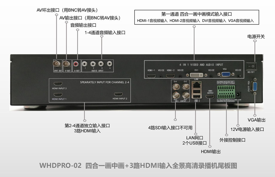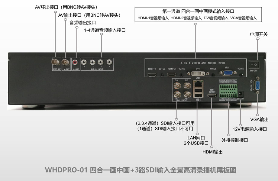 全景高清录播机WHDpro机型,是会议录播机中的高端机型。有四个输入通道,其中第一个通道,为四个音视频输入可以录制为一个文件的通道既全景录制通道。第二、第三、第四通道为各自独立录制通道,可以选为SDI输入(机型为WHDpro-01),也可选为HDMI输入(机型为WHDpro-02),或者定制为其他接口输入。该四个通道可以同时或者任选一个通道录制。