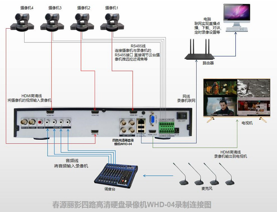 从摄像机A的HDMI输出接口用HDMI高清线连接至录播机的HDMI 1输入接口;摄像机B的HDMI输出接口用HDMI高清线连接至录播机的HDMI 2输入接口。录播机的HDMI输出接口用HDMI高清线接入电视机的HDMI输入接口。从最后一台QX-02麦克风的3.5音频输出接口用随机配送的音频线接入录播机的麦克音频输入接口。