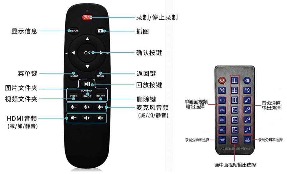 HDT104机器前面板具有简洁明晰、反应快捷的操作按键。可以一键开启或者停止录像;可以一键截图;可以一键切换H265/H264格式。可以一键切换4路输入的显示模式;可以一键切换音频输入模式。同时,随机配有2个功能简洁、小巧精致的遥控器。1个是录像功能遥控器(如下图);1个是画面模式、音频选择遥控器(如下图)。
