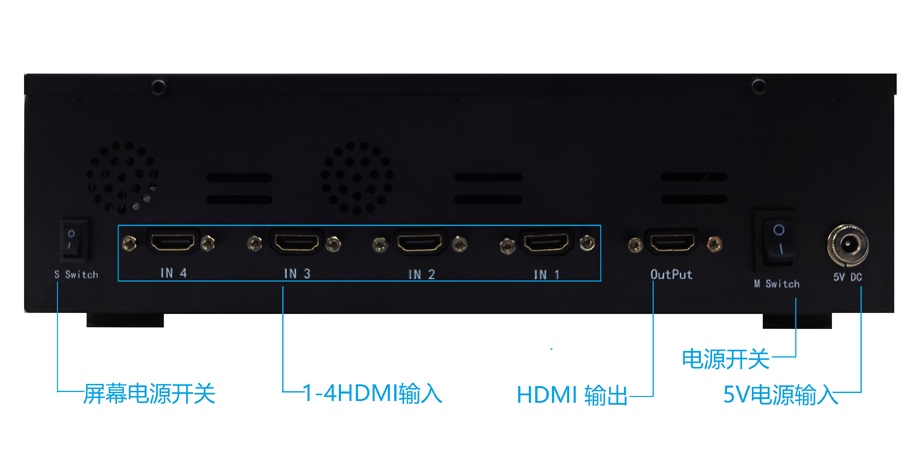 尾板分别有总硬电源开关、5V8A电源插口、1个HDMI输出接口、4个HDMI输入接口、屏幕开关。