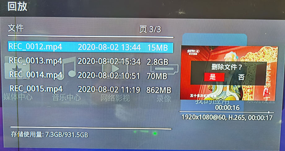 HDT104,不仅支持1080P60高清录制,也具备了回放功能。通过配送的遥控器,可以一键进入录制文件列表。录制的文件不仅有总编号,也以录制时间先后同步排序,大大方便了浏览回放。在文件列表右边,有文件预览小窗口,会自动预览播放,根据需要按下遥控器的OK键,即可全屏播放。播放时,有快进、快退、暂停按钮。