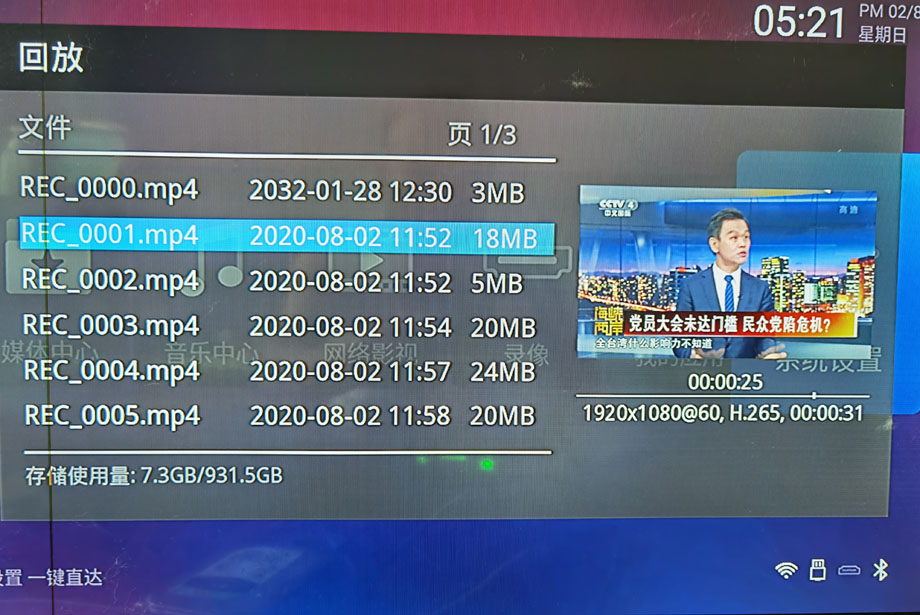 HDT103,不仅支持1080P60高清录制,也具备了回放功能。通过配送的遥控器,可以一键进入录制文件列表。录制的文件不仅有总编号,也以录制时间先后同步排序,大大方便了浏览回放。在文件列表右边,有文件预览小窗口,会自动预览播放,根据需要按下遥控器的OK键,即可全屏播放。播放时,有快进、快退、暂停按钮。