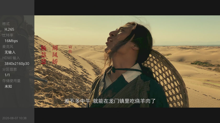FHD: 1080P60, 1080P50, 1080I60, 1080I50,1080P30, 1080P25, 1080P24。HD: 720P60, 720P50。SD: 576P50, 480P60, 576I50, 480I60。音频支持PCM。编码规格为,音视频为H.264 High profile/H265 main profile, AAC,图片为JPEG。H264压缩时,视频码率设定为UHD 16Mbps, FHD 12Mbps, HD 8Mpbs, SD 4Mbps。H265压缩时,视频码率设定为UHD 12Mbps, FHD|HD 8Mbps, SD 4Mbps。音频码率设定为320Kbps。录制音视频文件格式为MP4,图片文件格式为JPG。