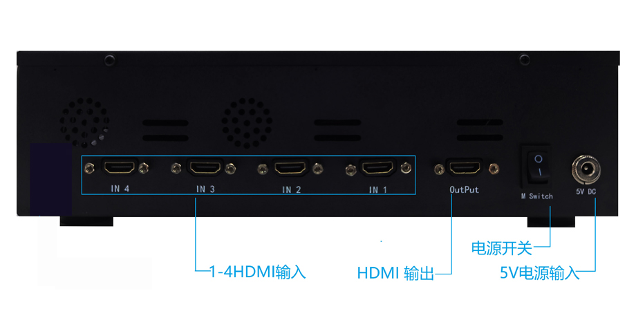 尾板分别有硬电源开关、5V2A电源插口、1个HDMI输出接口、4个HDMI输入接口。