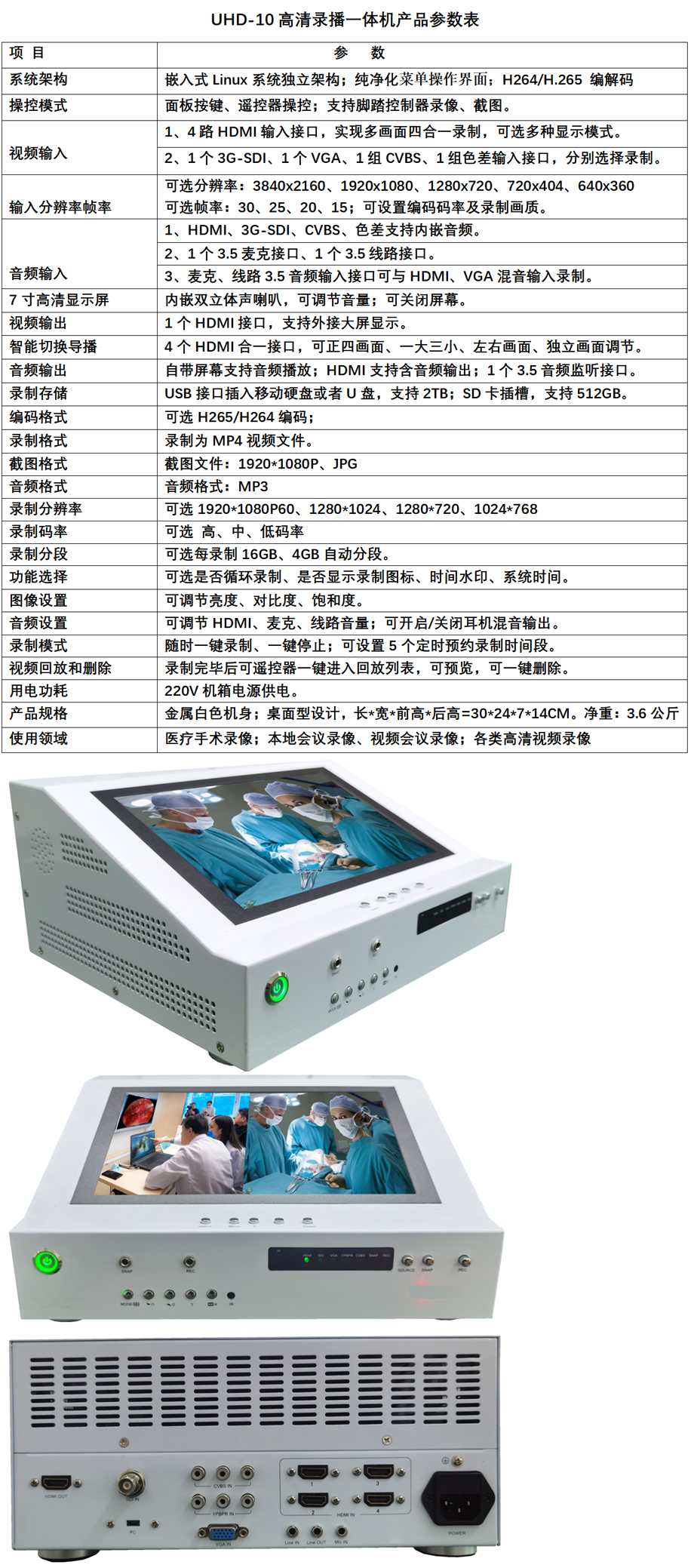 UHD-10是深圳春源丽影电子科技有限公司新近推出的一款多端口输入自带10.1寸高清显示屏多功能高清录播机。主要用于医疗手术录像。由于自动屏幕和喇叭,也可用于多摄像机本地会议室录像、投招标室录像、中小型审讯录像、问询室录像、视频会议录像等领域。由于输入接口全面,也支持高清粉丝家庭录制数字电视机顶盒、蓝光高清播放机、各类电脑、老式播放器设备等用途。