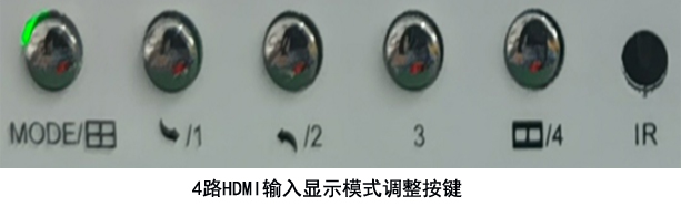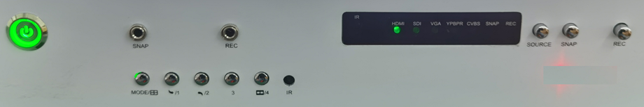 机器正前面,左边侧有一个弹出式亮灯开关;左侧上面分别是脚踏控制器截图和录像插口;左侧下面是多画面画中画模式调整按键和画面遥控接收窗;右侧上面分别是录像遥控接收窗、HDMI、SDI、VGA、色差、AV信号源选择指示灯、截图、录像状态指示灯。右侧上面分别是 信号源选择按键、截图按键、录像按键。