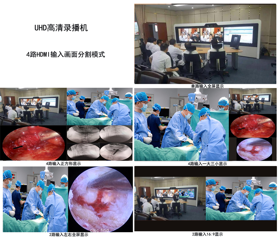 4个HDMI输入接口,同时输入时,支持多画面画中画显示和录制,支持任意输入路数多画面或者单画面显示和录制。医疗手术录像时,可以同时将内窥镜、术野相机、全景相机或者电脑PPT同时输入给HDMI接口,进行多画面录制;HDMI和他输入接口,支持每次选择一个类型录制。录制视频会议或者本地会议时,根据会议终端设备和会议摄像机输出接口,选择对应的输入接口。