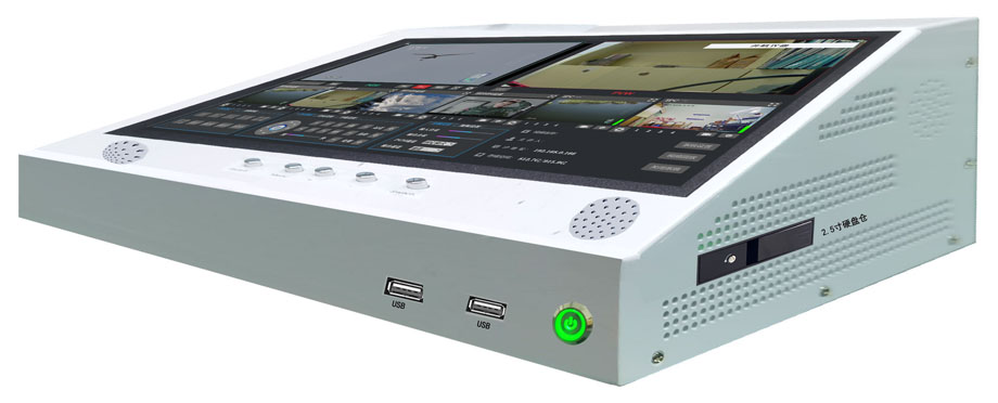整机以25度角斜面铺屏,视角科学,便于观察和操控。前面板前侧具有2个USB接口,便于插入移动硬盘资料拷贝,右侧触控电源开关,开关机方便。