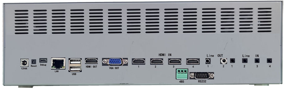 机器尾板,具有4个HDMI输入接口,支持分别内嵌各自音频输入分别录制;具有1个自适应LAN网口,不仅支持网络操控和网络直播,还支持同时拉流输入6路IPC网络信号。