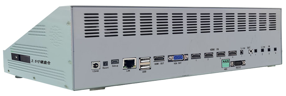 具有4个3.5音频输入接口,可以同时混入4种音频混音录制。具有1个RS232\1个485接口,支持中控操控。具有1个HDMI、1个VGA输出接口,支持外接大屏显示。