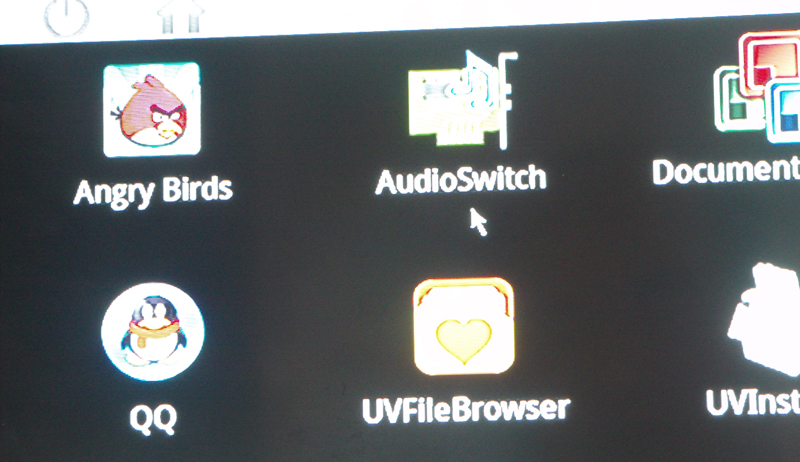 丽影588多媒体微电脑由于具有丰富的音频输出模式,出厂默认设置不一定符合客人使用的连接电视机的模式,因此有些客人初次连接电视机时,有时由于不是默认连接方式而发现没有声音,现将声音调整方式介绍如下: 丽影588进入开机界面后,主界面显示的是主要功能端口,见图一。 图 二 图 一 开机界面的左边有个便捷选项按钮图标,类似一个遥控器,见图二,。上面的圆圆地球图标是进入浏览器的入口,下面的那个外面一个圆圈里面一个圆钮的图标是基本设置的入口,中间那个四纵四横的多个方形的图标是进入应用系统的入口。 用鼠标点击应用系统入口,进入应用系统界面,见图三。 图 三 在顶部第一行的左边第二个图标,见图四,为声音调整按钮,英语名称为AudioSwitch。 图 四 点击声音调整按钮 按钮,进入音频输入输出模式,见图五。在顶部的“自动”选项后面打勾即完成了音频输出调整。 返回后继续使用就可以了。 图 五