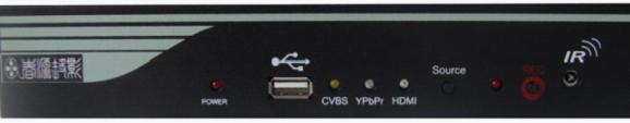 HDT-2硬盘录像机前面板的中间,有个视频源切换键souce,靠近切换键的左边分别有AV、色差、HDMI视频源信号灯。因为是用HDMI高清线从播放设备连接到HDT-2的,要通过切换键,将视频源切换到HDMI信号灯闪亮即可。电视机上显示HDT—2的开机界面后,然后提示USB设备已经连接,然后就出现了摄像头正在拍摄的画面了。