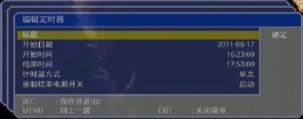 预约录像功能,是非常实用的功能。可以让客人不用久等待节目就可以提前设置,到时自动录像并在录像完毕后自动停止。设置方式是,进入主菜单界面,点击定时器,进入定时录制菜单。按遥控器的OK键,出现编辑定时器。可以根据需要设置标题,也可不设置。根据目的录像时间设置好开始日期、开始时间、结束时间以及计时器方式和录像结束后的电源开关与否。设置好后,按遥控器的REC键保存并退出。