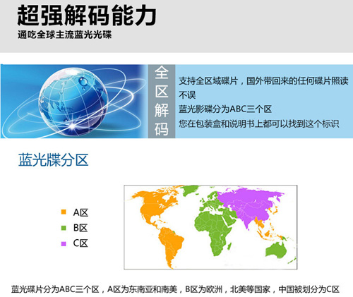 4、没有区域限制的蓝光光盘播放机。当前的正版蓝光视频在国际上分A、B、C三区,A区为东南亚和南美,B区为欧美,C区专为中国。常规的蓝光播放机,只能支持单区解码,例如国产机型,基本只能播放C区标志的光盘,而很多从国外带回来的蓝光盘则不能播放,即使稍微先进一点的机器,也只能支持其中的一两个分区。而SLW-1则具有无分区限制解码播放功能,全球各类光盘,都可以无忧使用。该功能是一次光盘播放机的历史性革命,极大的方便了消费者。