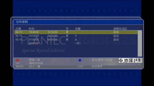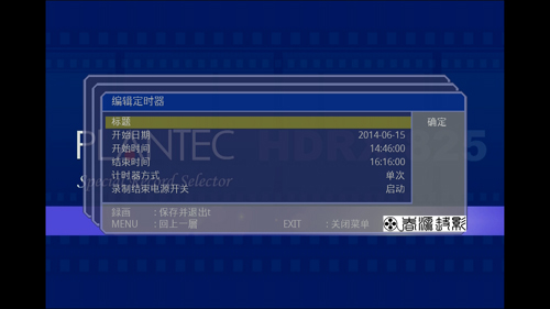 预约设置:进入菜单界面的定时器界面,按确认键,依次可以进行标题、开始日期、开始时间、结束时间、计时器方式、录制结束电源开关与否等操作界面,根据个人需要进行逐项设置。标题可以设置字母、编号,预约时段不受限制,只要每个预约的时间段不交叉即可。如设置为2014年6月14日的23点10分开始,6月15日的1点30分结束;再设置6月15日的1点40分开始,2点40分结束;再设置为2点41分开始,4点50结束;这样顺延时间依次设置就好。每次设置时,屏幕下面有相关按键操作提示,认真操作即可。
