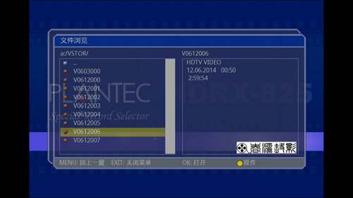 预约时间设定后,可以关闭电视机,只需开着机顶盒或者播放器和录像机就好。到达设定的时间,录像机会自动开始录制,录制时段结束后,自动待机等到设置的其他时段到达时间再次开始录制。其中的录制结束电源开关,根据个人情况设置,如果设置为关,则录像时段录制完毕后,录像机就自动关闭电源。 7、浏览播放 HDT系列录像机不仅可以高清录像,还可播放本机录制的高清视频。录像机录制的视频文件格式是H264,文件名为DAT后缀TS,属于正宗高清视频文件。进入菜单界面的文件浏览,再进入NO LABEL端口下面的VSTOR文件夹,就看到已经录制的文件了,录像文件是根据录像时间排序的,点击想播放的文件即可播放。按遥控器的方形停止按钮就停止播放。还可以按遥控器的快捷键既遥控器上面的右箭头播放键进入播放。