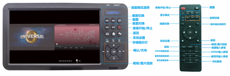 该机是春源丽影新近打造的一款便携式多功能录像机。自带7寸高清显示屏,不仅可接家庭直流电使用,还可插入充电电池移动录播。具有2路支持4K输入的HDMI接口,可以同时进行画中画录像。支持插入528GB的SD卡或者U盘录播,固定使用的时候,可以接入8TB的移动硬盘录播。支持长时间连续录播。不仅支持HDMI含音频输入录制,还具有3个3.5寸音频输入接口,可与HDMI音视频混音同步录制。录制的视频达到了1080P60hz的高清效果。可以一键高清截图,一键进入播放列表,不用的文件,可以一键删除。该机具有HDMI输出接口,可以外接大型电视机显示,还支持接入电脑进行录播和因特网推流直播使用。机器面板有功能全面的灵敏按键,还配有小巧精致的遥控器。
