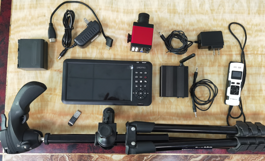 将插入了充电电池的UHD-01录像平板、LP摄像头固定在三脚架上,将FJ-02接入UHD-01,并且与发射器配对,设备开通电源即可音视频录影。所有设备、配件,购买时均可一站供应!买回家即可使用。
