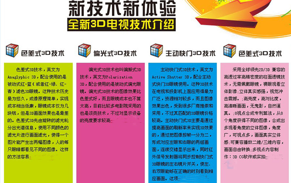 3D是three-dimensional的缩写,就是三维立体图形。由于人的双眼观察物体的角度略有差异,因此能够辨别物体远近,产生立体的视觉。三维立体影像电视正是利用这个原理,把左右眼所看到的影像分离。3D液晶电视的立体显示效果,是通过在液晶面板上加上特殊的精密柱面透镜屏,将经过编码处理的3D视频影像独立送入人的左右眼,从而令用户无需借助立体眼镜即可裸眼体验立体感觉,同时能兼容2D画面。 目前3D技术中,我们又可以细分出三种主要的类型:色差式、偏光式和主动快门式,也就是平常所说的色分法、光分法和时分法。 色差式3D技术 色差式3D技术,英文为Anaglyphic 3D,配合使用的是被动式红-蓝(或者红-绿、红-青)滤色3D眼镜。这种技术历史最为悠久,成像原理简单,实现成本相当低廉,眼镜成本仅为几块钱,但是3D画面效果也是最差的。色差式3D先由旋转的滤光轮分出光谱信息,使用不同颜色的滤光片进行画面滤光,使得一个图片能产生出两幅图像,人的每只眼睛都看见不同的图像。这样的方法容易使画面边缘产生偏色。 偏光式3D技术 偏光式3D技术也叫偏振式3D技术,英文为Polarization 3D,配合使用的是被动式偏光眼镜。偏光式3D技术的图像效果比色差式好,而且眼镜成本也不算太高,目前比较多电影院采用的也是该类技术,不过对显示设备的亮度要求较高。 偏光式3D是利用光线有“振动方向”的原理来分解原始图像的,先通过把图像分为垂直向偏振光和水平向偏振光两组画面,然后3D眼镜左右分别采用不同偏振方向的偏光镜片,这样人的左右眼就能接收两组画面,再经过大脑合成立体影像。 目前在偏光式3D系统中,市场中较为主流的有RealD 3D、MasterImage 3D、杜比3D三种,RealD 3D技术市占率最高,且不受面板类型的影响,可以使任何支持3D功能的电视还原出3D影像。不过这种技术会使画面分辨率减半,很难实现真正的全高清3D影像,而且画面亮度也会被大大降低。在液晶电视上,应用偏光式3D技术要求电视具备240Hz以上刷新率。 主动快门式3D技术 主动快门式3D技术,英文为Active Shutter 3D,配合主动式快门3D眼镜使用。这种3D技术在电视和投影机上面应用得最为广泛,资源相对较多,而且图像效果出色,受到很多厂商推崇和采用,不过其匹配的3D眼镜价格较高。 主动快门式3D主要是通过提高画面的刷新率来实现3D效果的,通过把图像按帧一分为二,形成对应左眼和右眼的两组画面,连续交错显示出来,同时红外信号发射器将同步控制快门式3D眼镜的左右镜片开关,使左、右双眼能够在正确的时刻看到相应画面。这项技术能够保持画面的原始分辨率,很轻松地让用户享受到真正的全高清3D效果,而且不会造成画面亮度降低。 一般情况下,3D液晶电视屏幕刷新频率必须达到120Hz以上,也就是让左、右眼均接收到频率在60Hz以上的图像,才能保证用户看到连续而不闪烁的3D图像效果。目前,包括三星、松下、创维等品牌推出的3D电视,都是采用主动快门式3D技术。 3D立体电视优点 1、采用全球领先2D/3D 兼容的高透过率高精密度的柱面透镜技术,无需佩戴眼镜,裸眼观看立体影像。 2、立体真实感强,视觉冲击震撼。 3、高亮度,高对比度,高清晰画面,无鬼影,自然逼真。 4、8视点合成专利算法,从8个角度获得不同的图像,合成出多观看角度的立体图像,角度广,可视点多,画面真实立体感强。 5、可兼容播放二维/三维内容,画面自由转换。 6、多视点内容制作:3D CG软件或实拍。 3D电视缺点 1.易致“眼疲劳” 健康和安全也是3D立体显示急需攻克的难题。研究结果显示,观众在观看立体影像时,由于眼睛会迅速地来回移动,因而容易造成眼睛疲劳。 2.价格太贵 价格不便宜。3D电视要想真正走进普通家庭,似乎并非易事,高昂的价格足以让平民望而却步。尽管索尼公司在日前并未提到3D电视机的价格,然而分析师预计,早期3D电视机可能价值数千美元。据悉,具备收看3D节目能力的数位高解析(HD)电视机,当前在美国要价每部1000到5000美元。 3.引发一些严重疾病 据国外媒体报道,三星电子通过其澳大利亚网站发出警告,称收看3D电视对身体健康不利。三星在警告中罗列了一系列与这项技术相关的潜在危害性。 三星在题为《光敏性癫痫警告和其他健康风险》的报告中,列举了部分收看3D电视可能引发的一些严重疾病,其中最严重的疾病为中风。三星在警告中还列举了一系列因收看3D电视可能产生的身体不适,特别是对儿童和青少年来说更是如此,其中包括视力下降、头晕、视线模糊、眼睛或肌肉等出现不自主的抽动、恶心、抽搐、痉挛、方向障碍以及意识丧失等。