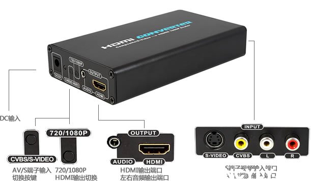 AV/S端子转HDMI视频转换器将CVBS或S-Video信号,AUDIO (L/R)立体声信号通过数字化处理转换为HDMI信号输出, 从而大大提高了图像和声音的品质效果,使CVBS或S-Video信号提升为1080P的逐行信号, 图像更为清晰稳定。 功能简介: